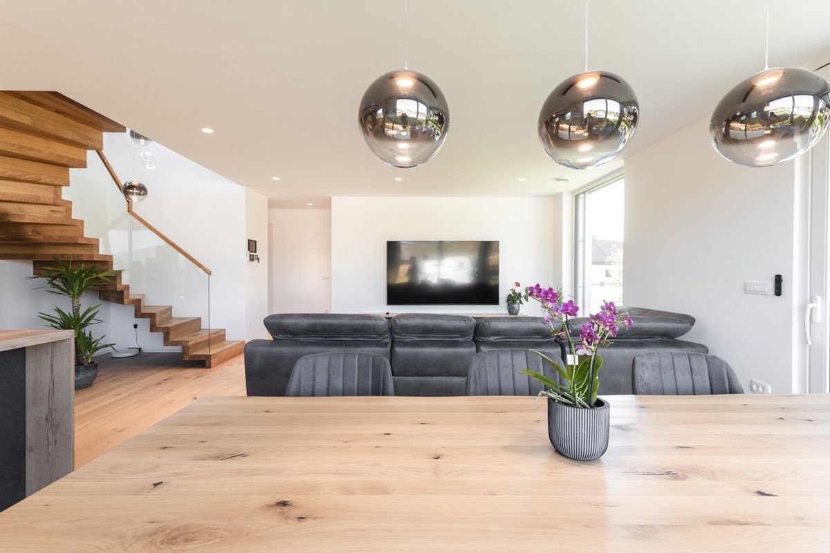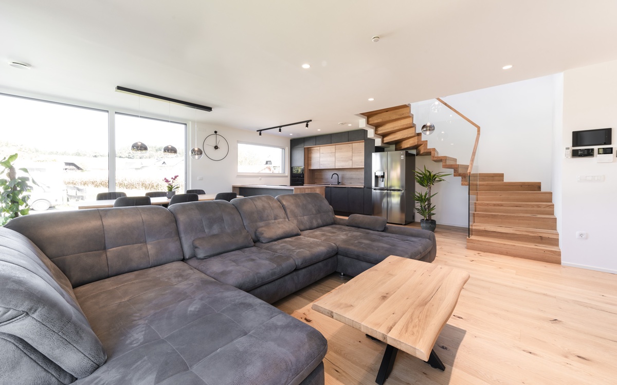- odprt in funkcionalen bivalni prostor z odprtim tlorisom (kuhinja–jedilnica–dnevni prostor),